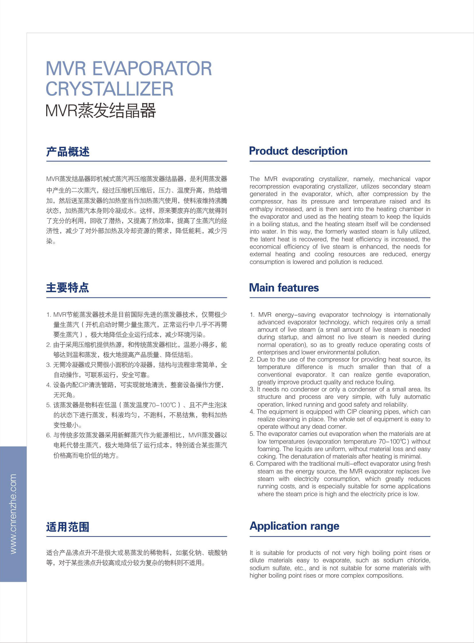 蒸發(fā)結(jié)晶設(shè)備的運作成本主要在能耗。而新一代MVR蒸發(fā)器是當前認可的環(huán)保的蒸發(fā)濃縮設(shè)備,它無需使用蒸汽,其基本原理是將從分離器蒸出來的二次蒸汽經(jīng)壓縮機壓縮后,補充十分之一的能量,蒸汽溫度升高,熱焓增大,然后進入蒸發(fā)器加熱室給循環(huán)物料提供熱量,而蒸汽本身冷凝并釋放出潛熱,冷凝下來的熱水又可以與原料換熱。循環(huán)往復(fù),蒸汽由壓縮機充能升溫,物料由蒸汽供熱蒸發(fā)、蒸汽又可以充分冷凝成水,熱水再給進料預(yù)熱,如此環(huán)環(huán)相扣,每一分熱量都得到了充分的利用,原料進去,出來的一是結(jié)晶固體,一是常溫冷卻水,環(huán)保又節(jié)能。